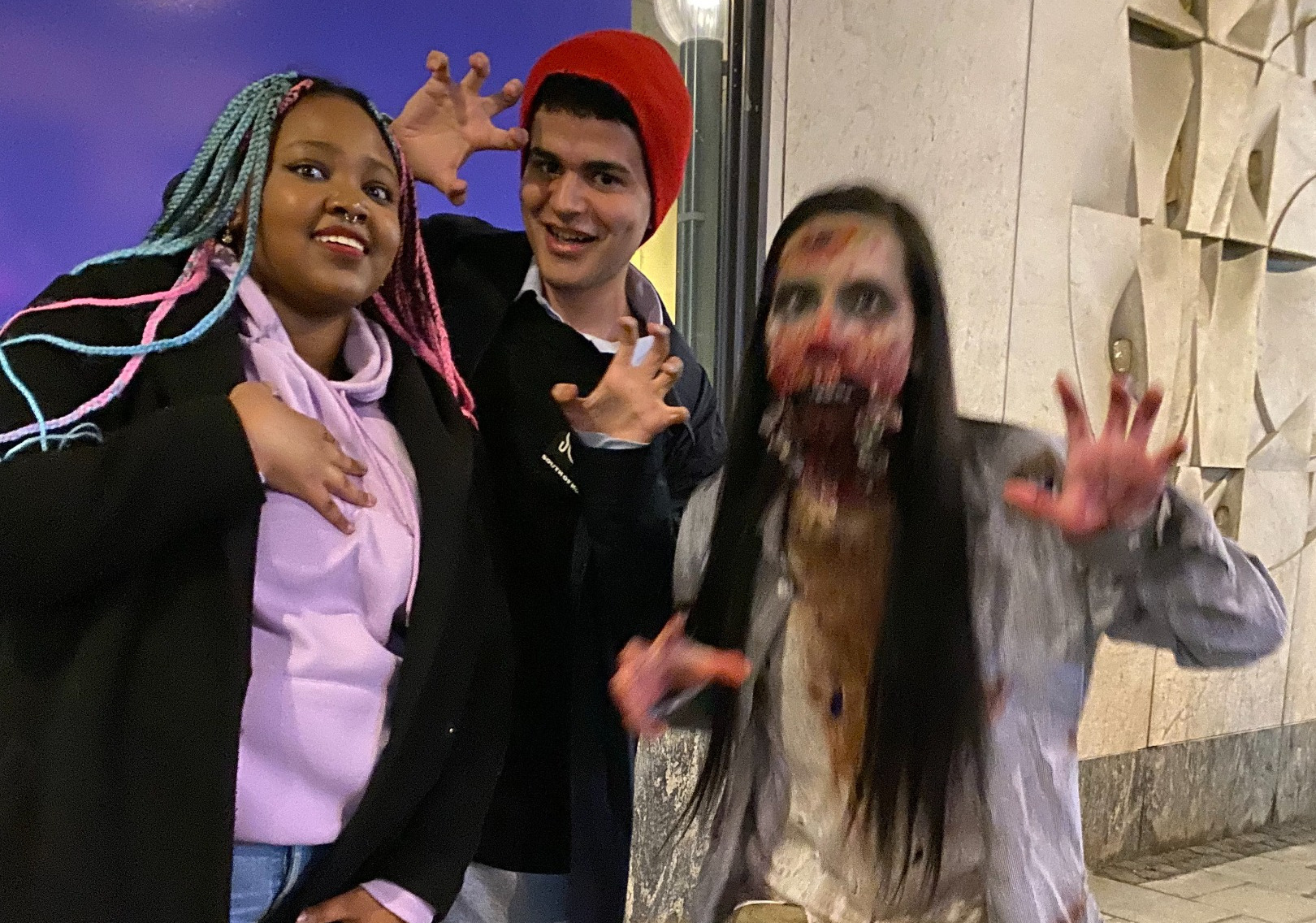 Prepare zombie sound and have it on a speaker. This will be the cherry on top for your makeup, costume and acting. Such sounds are plenty on the internet. I personally recommend this sample on Youtube, which is what I used last Halloween: https://www.youtube.com/watch?v=RN5Ut9KX33I