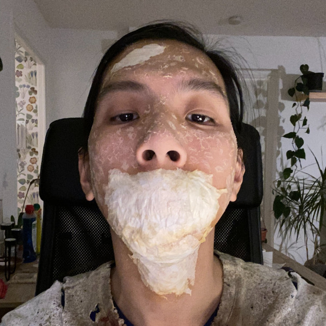 Use a big piece of paper to cover your mouth, then build up smaller pieces around it all the way down to your throat. Build 3 layers of paper, add liquid latex in between layers. Using the disposable sponge, add a very thin layer of liquid latex on your skin. Once this layer is dry, rub your finger back and forth to tear it up and create holes on your skin. Your skin is supposed to deteriorate.