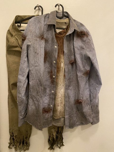 Go to Myrorna and find some cheap shirts and a pair of pants. Then shred them, distress them, spray them with brown and green to add dust and mold, then paint them with red color and fake blood. Once dried, they are good to go! Below is a youtube video explaining the process with more details, watch it.